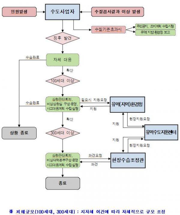 피해규모가 100세대 이상인 수돗물 사고가 발생하면 지자체의 수도사업본부장은 상황판단회의를 소집한 후 비상상황실을 운영하면서 필요 시 유역환경청의 지원을 요청할 수 있다.