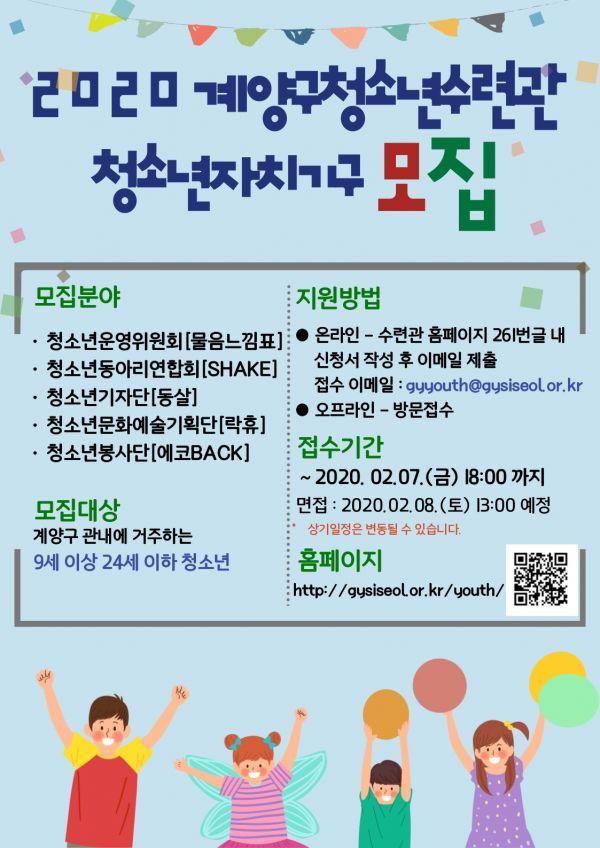 인천 계양구시설관리공단 계양구청소년수련관은 ‘2020년 청소년자치기구’를 오는 2월 7일까지 모집한다고 21일 밝혔다.