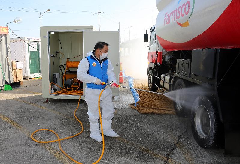 | 황은성 안성시장이 설알 직원들을 대신해 AI초소근무 중 축산차량 방역을 실시하고 있다. <사진=안성시청 제공> |