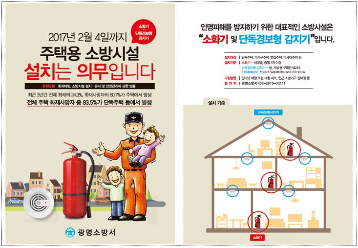 심재빈 광명소방서장은 “주택용 소방시설은 화재 발생 초기에 사용 가능한 소화기와 화재를 조기에 감지해 신속히 대피할 수 있도록 돕는 단독경보형 감지기로, 주택화재 시 소중한 인명과 재산을 지키는 일등공신이 될 것”이라며 “2017년 2월 4일까지 가정의 안전을 위해 주택용 소방시설을 의무적으로 설치하는데 적극 동참해 달라”고 당부했다.