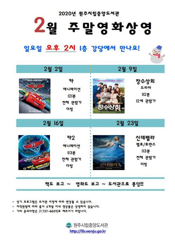 2월에는 어린이와 온 가족이 즐길 수 있는 ‘카’, ‘장수상회’, ‘카2’, ‘신데렐라’를 매주 일요일 오후 2시 도서관 1층 강당에서 차례로 상영한다.