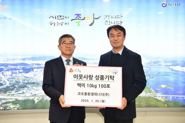 설 명절을 앞두고 코오롱환경에너지㈜가 지난 20일 하남시에 300만원 상당의 10kg 백미 100포를 기탁했다.