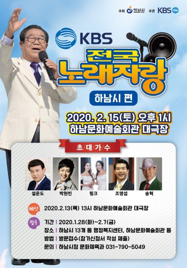 하남시는 오는 2월 15일 오후 1시 하남문화예술회관 대극장에서‘KBS전국노래자랑-하남시’편을 녹화한다고 22일 밝혔다.