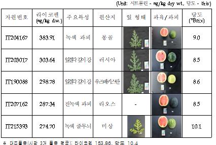 농촌진흥청은 수박 유전자원의 기능성 성분 대량 평가를 통해 라이코펜과 시트룰린 함량이 높은 유전자원을 선발했다.