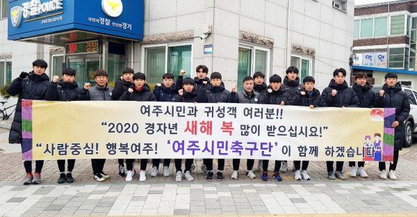 축구를 통해 여주시 홍보대사 역할을 톡톡히 하고 있는 여주시민축구단이 민족최대 명절 설날을 맞아 “여주시민과 귀성객 여러분 경자년 새해 복 많이 받으십시오. 사랑중심 행복여주 ‘여주시민축구단’이 함께 한다”라는 현수막을 내걸고 22일 여주시청 정문 앞에서 아침 8시부터 40분 동안 출근길 시민들에게 새해 인사를 전했다.