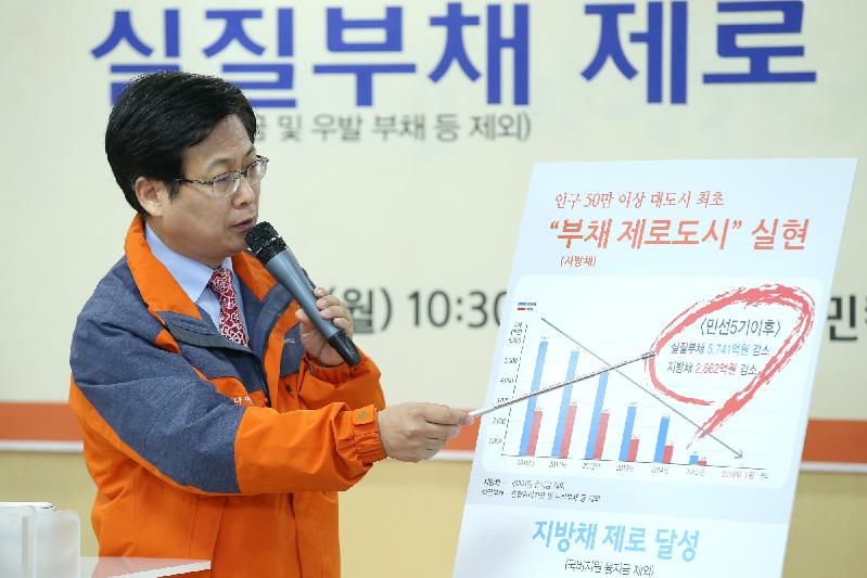| 최성시장이 실질부채 제로 도시와 관련하여 설명하고 있다.<사진=고양시청 제공> |