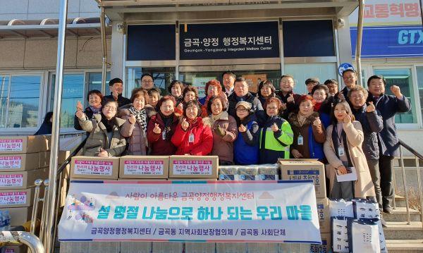 남양주시 금곡양정행정복지센터는 지난 21일 설 명절을 맞아 금곡동 지역사회협의체, 남부희망케어센터, 금곡동 지역 사회단체와 함께 지역사회에 소외된 어려운 이웃에게 후원물품을 전달하는 나눔 행사를 진행했다.