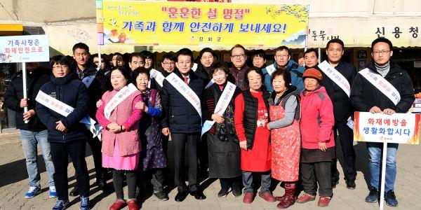 이번 행사는 유천호 군수를 비롯해 강화군, 강화군시설관리공단, 풍물시장상인회, 지역자율방재단, 민간단체 등 50여명이 참여한 가운데 훈훈한 설 명절 안전하게 보내기, 겨울철 전통시장 화재 안전 점검, 2020년도 국가안전대진단, 대설·한파 대비 국민행동요령, 내 집·내 점포 앞 눈 치우기, 안전신문고 앱을 통한 신고방법 등을 담은 홍보물을 군민들에게 배부했다.