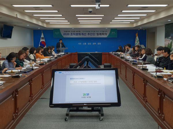 22일 시청 대회의실에서 개최한 ‘제1회 2020 조직문화개선추진단 회의’에는 부서별 1명씩 53명의 7급이하 공직자가 참여한 가운데 자유로운 분위기 속에서 진행했다.