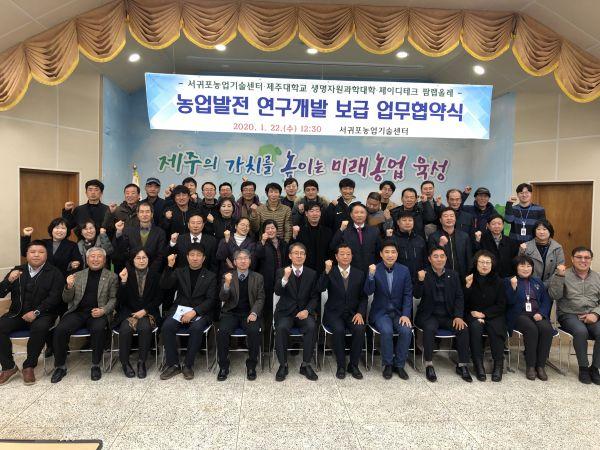 제주특별자치도농업기술원 서귀포농업기술센터는 22일 농업인교육관에서 제주대학교 생명자원과학대학과 제이디테크 팜랩올레와 함께 제주농업 발전 연구개발 보급을 위한 산학연 업무협약을 체결한다.