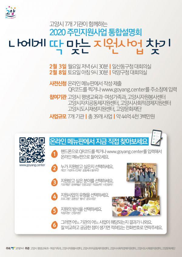 ‘2020 주민지원사업 통합설명회’는 학습동아리 지원사업, 마을공동체 지원사업, 예술활동 지원사업 등 44억4천만원의 예산으로 고양시에서 추진하는 39개 사업을 한 번에 살펴볼 수 있는 자리다.