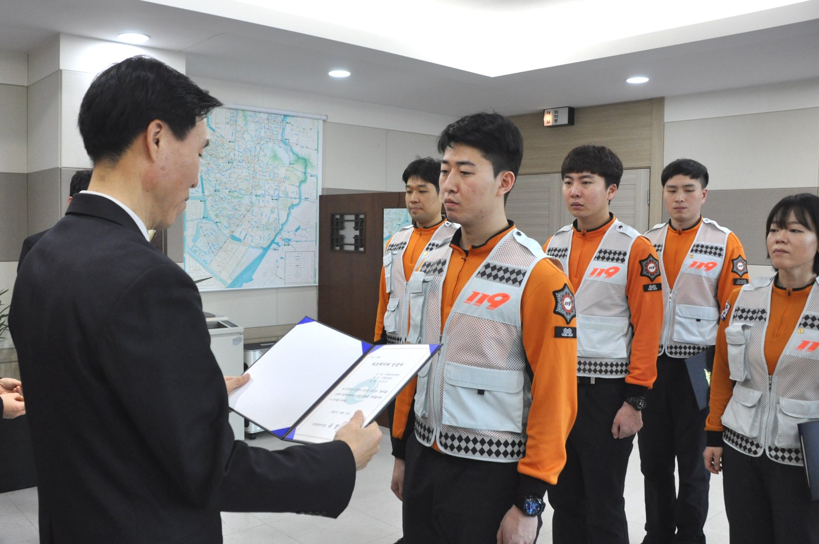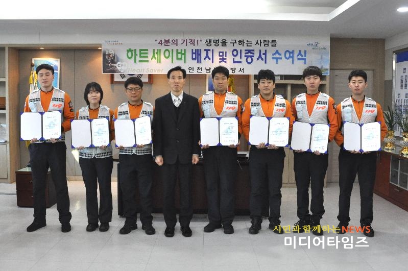 [미디어타임즈=문상수 기자] 인천남부소방서(서장 김성기)는 3일 심폐소생술을 활용해 심정지 환자를 소생시킨 오충교 대원 등 7명에게 하트세이버 인증서를 수여했다.하트세이버(Heart Saver)란 심폐소생술로 심장을 소생시킨 사람, 즉 인명을 소생시킨 사람이란 뜻으로 호흡 및 심정지 등으로 위험에 놓인 응급환자에 빠르고 정확한 대처로 생명을 구한 사람에게 수여하는 상으로 생명 지킴이라 불린다.이들은 호흡과 맥박이 없는 심장이 정지된 환자를 적극적인 심폐소생술과 자동제세동기를 사용해 심장을 다시 뛰게 한 구급대원으로 자긍심을 고취시키기 위해 인증서를 수여했다.김성기 인천남부소방서장은 열악한 근무여건에서 구급대원이라는 사명감으로 귀중한 생명을 살리기 위해 최선의 노력을 다해 준 대원들을 격려하고 “앞으로도 시민들을 대상으로 정확한 심폐소생술 익히기를 활성화 해 심정지 환자의 소생률을 높이는데 힘써 줄 것”을 당부했다.