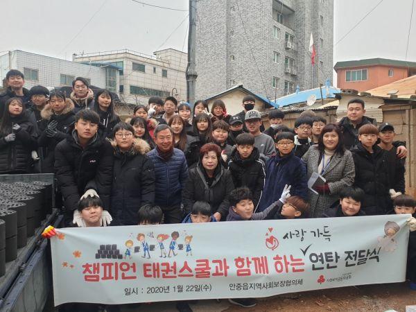 평택시 안중읍 챔피언 태권스쿨 이용 학생 40여명은 지난 22일 추운 겨울을 맞아 안중읍지역사회보장협의체의 추천을 받은 독거어르신 댁을 직접 방문해 사랑이 가득 담긴 ‘연탄 500장’을 전달했다.