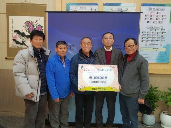 용인시 기흥구 기흥동은 23일 고매2통 주민들이 이웃돕기 모금 운동인 사랑의 열차를 통해 성금 100만원을 기탁했다고 밝혔다.