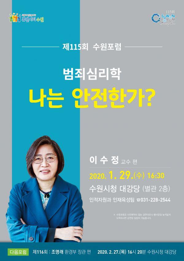 제115회 수원포럼 범죄심리학자 이수정 교수 편, 29일 오후 4시 30분 수원시청에서
