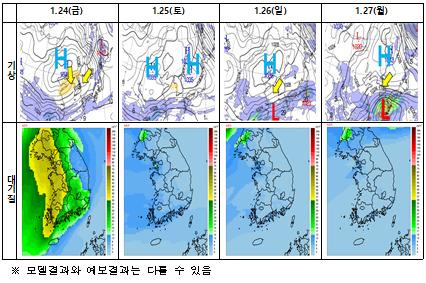 연휴 첫 날인 1월 24일은 수도권·충청권 등 서쪽지역에서 초미세먼지 농도가 높을 것으로 보이나, 25일부터는 전국적으로 낮은 수준 예상