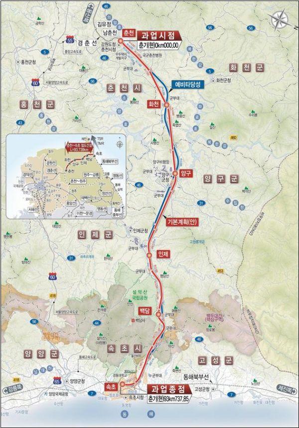 ‘춘천~속초간 동서고속화철도’사업에 대한 기재부 총사업비 협의결과, 화천, 양구, 인제, 백담, 속초역 5개 역사와 춘천구간 지하화 6.5km를 포함해 2조 2,840억원으로 23일 총사업비 협의를 완료했다.