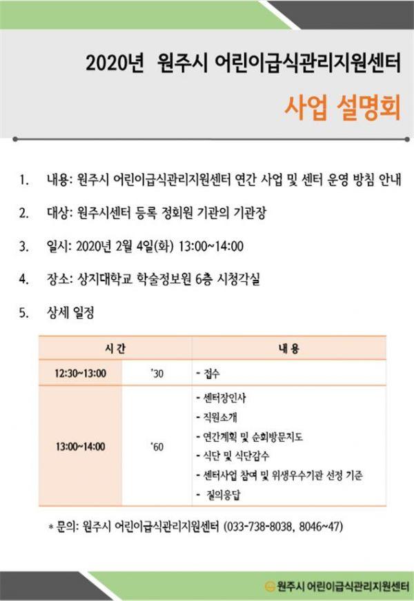 원주시 어린이급식관리지원센터는 오는 2월 4일 오후 1시 상지대학교 학술정보원에서 ‘2020년 사업 설명회’를 개최한다.
