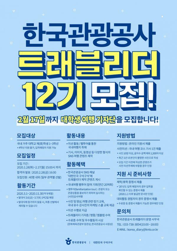 문화체육관광부와 한국관광공사는 올 한 해 대한민국 구석구석을 누비며 SNS를 통해 국내 여행지를 홍보할 대학생 기자단 ‘트래블리더’를 28일부터 오는 2월 17일까지 모집한다.