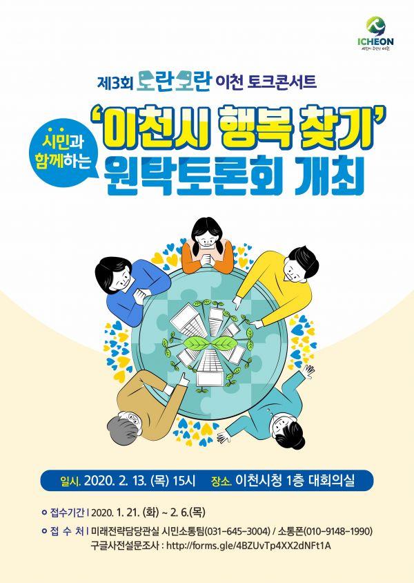 이천시는 다음달 13일 오후3시 시청 대회의실에서 ‘시민과 함께하는 이천시 행복 찾기’라는 주제로 100명의 시민들과 함께하는 제3회 도란도란 이천토크콘서트를 개최한다.