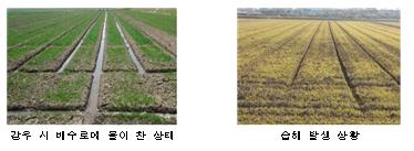 배수가 불량한 곳은 양쪽 배수로를 열어주고 배토기 등을 이용해 배수구를 다시 정비해 습해를 예방한다.