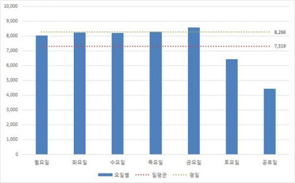 요일별: 평일 중에는 금요일이 일평균 857만명으로 가장 많았고 월요일이 803만명으로 다른 요일에 비해 상대적으로 적었다.