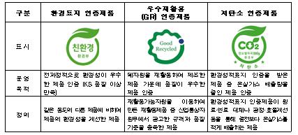 녹색제품은 에너지·자원의 투입과 온실가스 및 오염물질의 발생을 최소화하는 제품으로 ‘환경표지 인증제품’과 ‘우수재활용 인증제품’으로 구성되어 있다.