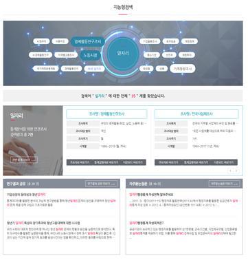 ‘지능형검색서비스’는 이용자의 검색 키워드에 대해 통계자료에서부터 용어, 관련 연구결과물을 통합적으로 제공한다.