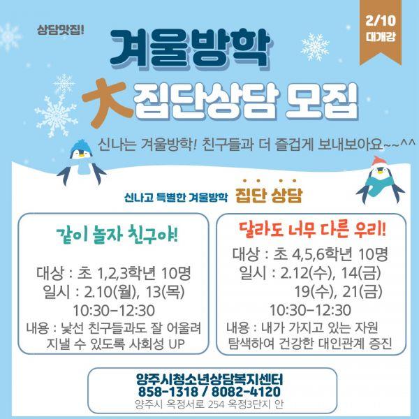 양주시청소년상담복지센터는 오는 2월 7일까지 ‘겨울방학 집단상담’에 참여할 청소년을 모집한다.