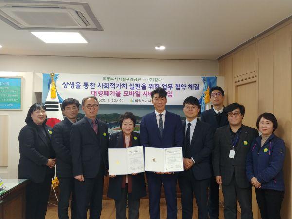 의정부시시설관리공단은 지난 22일 ㈜같다와 ‘대형폐기물 배출 모바일 서비스’ 도입을 통해 민관 상생해 사회적 가치를 실현하기 위한 업무협약을 체결했다.