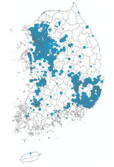 전국적으로 보았을 때 자동차 산업 기업은 수도권, 영남권에 집중되어 있으며 광주, 군산, 전주 등 지역 거점에 국지적으로 집중된 패턴이 나타났다.