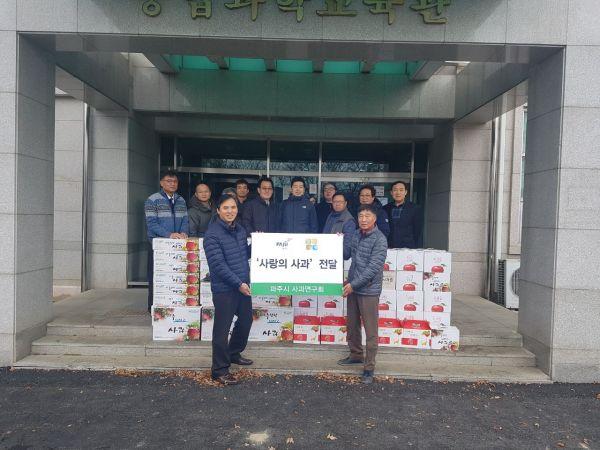 파주시 사과연구회는 지난 28일 공유농업 실천 일환으로 불우한 이웃들을 돕기 위해 사랑의 사과 81박스를 파주시에 전달했다.