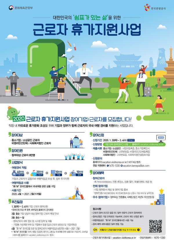 문화체육관광부와 한국관광공사가 휴가문화 개선과 국내여행 활성화를 위해 실시하는 ‘근로자 휴가지원 사업’은 근로자가 20만원을 부담하면 기업이 10만원, 정부가 10만원을 함께 지원해 근로자가 적립된 40만원을 국내여행 경비로 사용하는 사업이다.