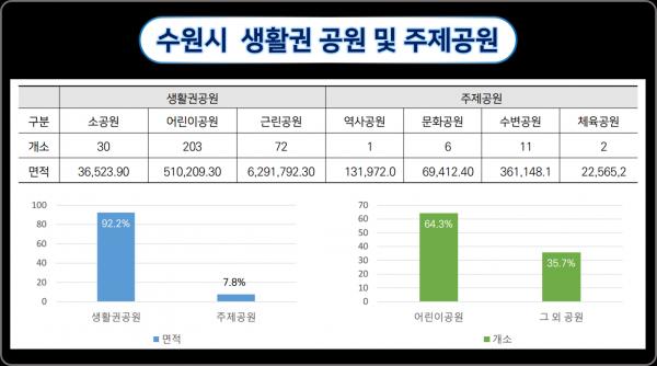 연구 결과, 수원시에는 지난해 10월 말 기준 소공원 30개소, 어린이공원 203개소, 근린공원 72개소 등 생활권공원과 역사공원 1개소, 문화공원 6개소, 수변공원 11개소, 체육공원 2개소 등 주제공원이 있다.