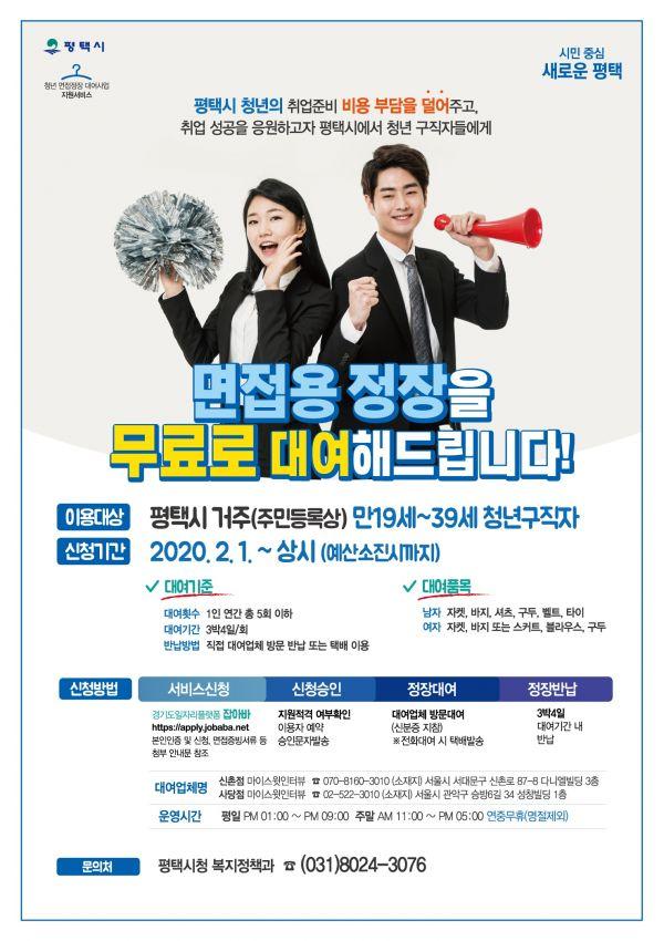 평택시는 2020년 2월 초부터 지역 내 거주하는 청년들을 대상으로 취업준비 부담을 감소하고자 취업 면접에 필요한 정장을 무료로 대여해주는 ‘청년 면접정장 무료대여 서비스’을 추진한다.
