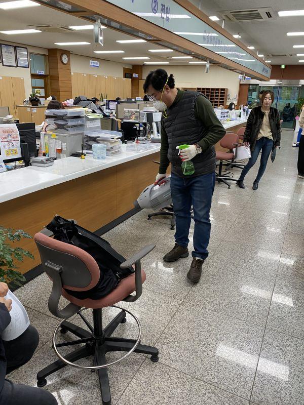 휴대용 연막분무소독기와 휴대용 분무소독기를 메고 건물 곳곳을 꼼꼼히 연무 방역을 실시하며 시민들이 조금이라도 안심할 수 있게 노력했다.