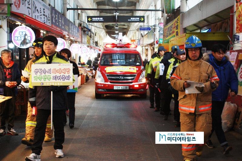 [미디어타임즈=문상수 기자]부평소방서(서장 노경환)는 9일 부평구 전통시장 내 소방차의 재난현장 도착시간 단축을 위한 소방차 통행로 확보훈련을 실시했다. 이 날 캠페인은 소방차 길 터주기의 대국민 공감대 확산과 비정상의 정상화 과제로 안전문화의식 향상을 위해 실시하였으며 시장 내 화재가 발생할 경우 소방차량의 진입 여부가 중요한 만큼 소방, 구청, 경찰 등 유관기관이 함께 참여하여 통행확보 훈련을 실시하고 불법 주․정차 금지 등 가두안내방송을 통해 홍보활동도 전개하였다.소방서 관계자는 “전통시장 내 화재 발생 시 현장에 진입 할 수 있는 활동여건 확보가 중요하다”이라며“지속적인 확보훈련을 통해 경각심 제고와 안전문화 의식을 향상을 위해 노력할 것”이라고 전했다.