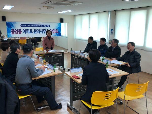 중앙동행정복지센터는 지난 29일 아파트 거주 위기가구 발굴 및 협력 방안을 논의하기 위해 관내 아파트관리소장 간담회를 실시했다.