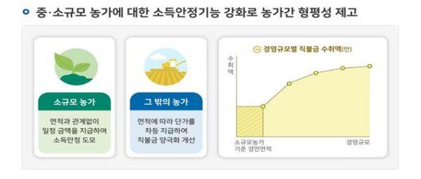 ‘소농직불제’는 소규모 농가에게 면적에 관계없이 일정금액을 지급하며 소규모 농가의 기준은 경지면적, 영농종사기간, 농촌거주기간, 농외소득 등을 고려해 결정된다.