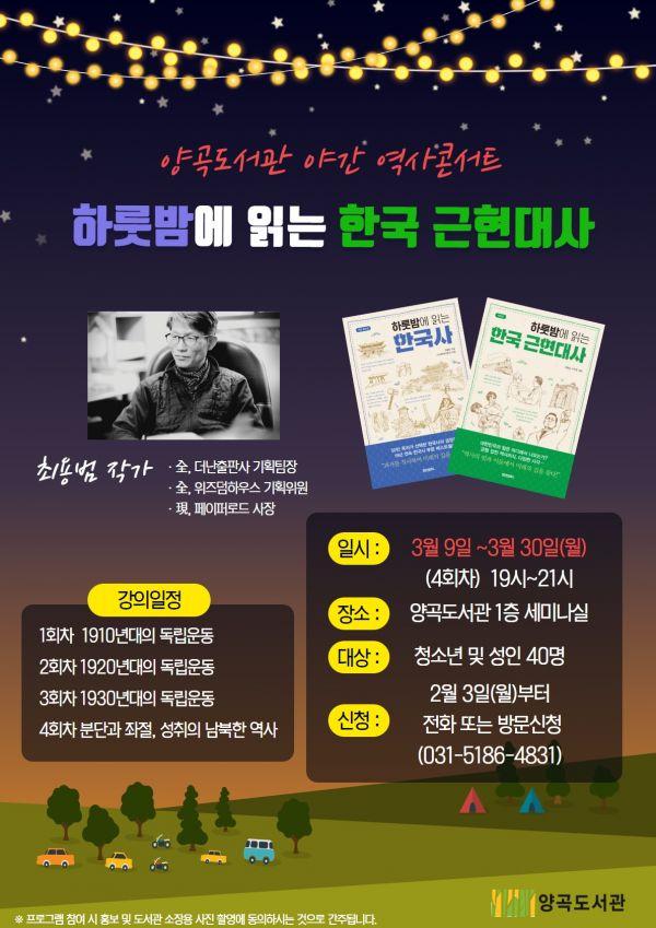 김포시 양곡도서관은 2020년 김포시 도서관 개관시간 연장운영 계획과 관련해 야간 역사콘서트 ‘하룻밤에 읽는 한국 근현대사로 보는 독립운동이야기’ 강좌를 운영한다.