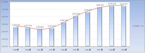 서울시 자동차 누적 등록대수는 3,124,157대, 전국 대비 13.19%를 차지하고 전년 대비 증가율 ?0.02%로 전국 시도 중 유일하게 감소했다.