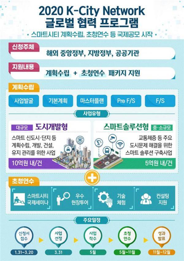 ‘K-City Network’ 글로벌 협력 프로그램은 해외 정부와 공공기관이 추진하는 스마트시티 사업을 대상으로 마스터 플랜 수립 또는 타당성조사 등을 지원하고 초청연수, 기술 컨설팅 등을 패키지로 병행해 한국의 스마트시티 개발 경험과 지식을 공유하는 사업이다.