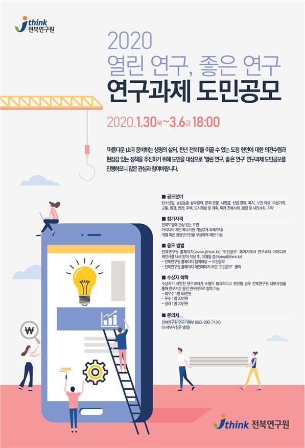 전북연구원은 도민 밀착형 정책 개발을 위해 제6회 ‘열린 연구, 좋은 연구’ 도민 공모를 실시한다고 30일 밝혔다.
