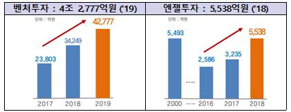 2019년 벤처투자는 4조 2777억원으로 2018년 대비 25% 증가하며 역대 최초로 4조원을 훌쩍 뛰어넘었다.