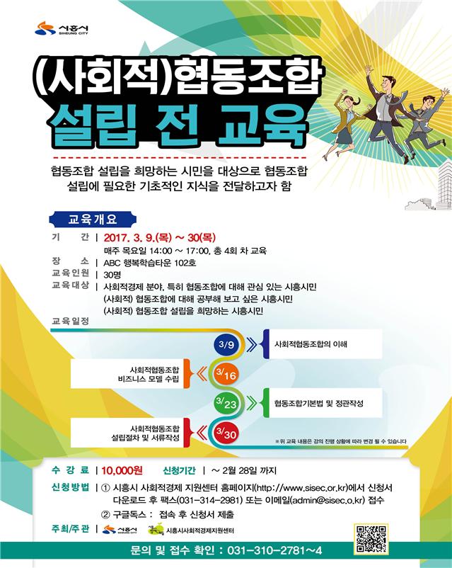 [미디어타임즈= 신정식 기자] 시흥시 사회적경제 지원센터는 시흥시민을 대상으로 협동조합에 관한 기초지식을 전달하고 협동조합 설립절차에 대한 이해를 돕는 「(사회적)협동조합 설립 전 교육」 수강생을 모집한다.