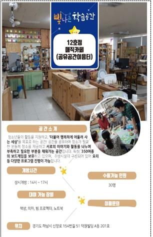 ‘빛나는 학습공간’은 마을 단위 커뮤니티 공간으로 조성해 지역 내 편의시설 · 공공시설을 학습공간을 개방해 시민 ? 공간 ? 학습연결로 활용성을 높이고 학습자원의 생활밀착형 평생학습 기회를 확대하는 사업이다.