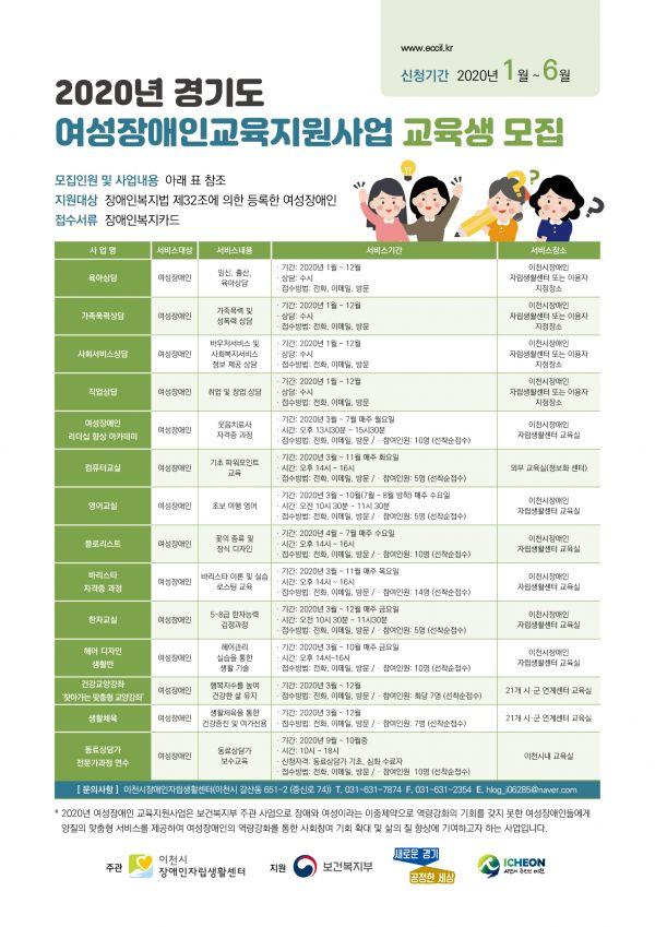 이천시장애인자립생활센터는 ‘경기도 여성장애인교육지원사업’ 교육생을 모집한다.