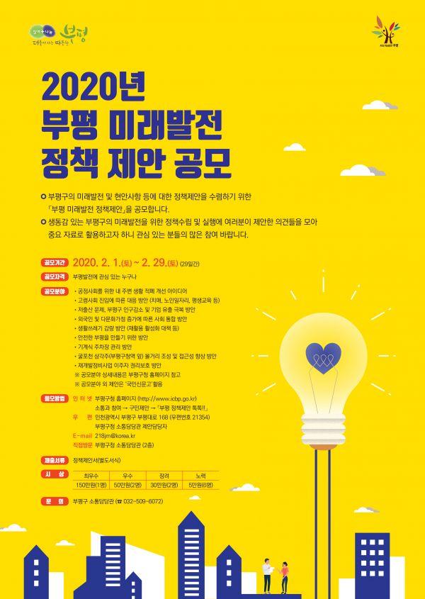 부평구가 부평의 미래발전 및 현안사항에 대한 정책 제안을 수렴하기 위해 오는 2월 3일부터 29일까지 한 달간 2020년도 ‘부평 미래발전 정책제안 공모’를 실시한다.