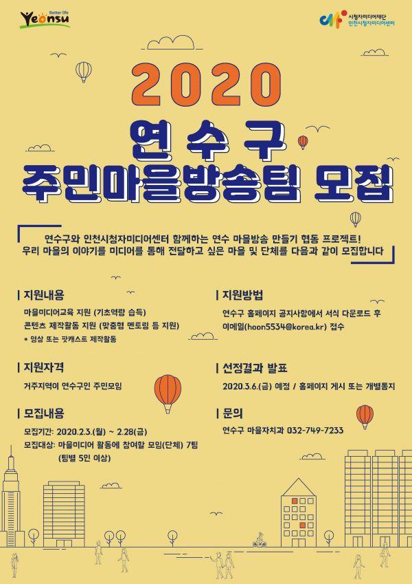 연수구는 구민의 자발적인 미디어 참여와 마을미디어 활성화 사업의 일환으로 추진하는 주민마을방송팀 지원사업에 참여할 모임을 모집한다.