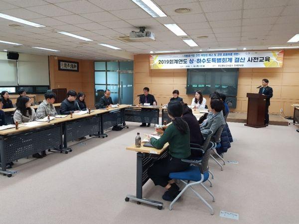 2019회계연도 결산서 작성에 따른 직원들의 업무 이해도를 높이고자 마련된 이번 교육은 상·하수도 특별회계 회계 감사인들이 참석해 재무결산을 위한 조사서 작성 기준과 작성 방법 및 유의사항에 대해 설명하고 결산업무 담당자들이 작성 시 궁금했던 점들을 질문하고 답변하는 방식으로 진행됐다.